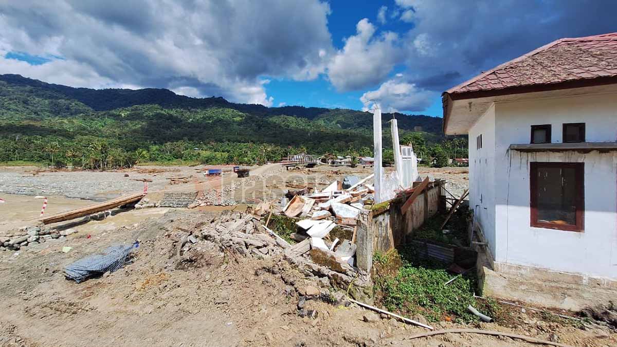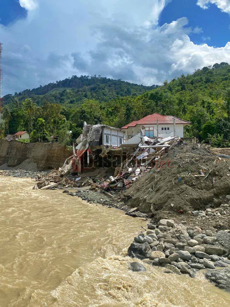 Di sisi lain sungai, bangunan permanen tampak terbelah dan menggantung di tebing yang tergerus. Beberapa rumah nyaris runtuh sepenuhnya, sebagian lainnya tinggal menyisakan rangka dan dinding. Puing-puing bangunan berserakan di lahan yang baru saja longsor. Dinding runtuh, tiang patah, dan tanah basah menjadi saksi betapa cepat bencana menghapus rasa aman. Sebuah jembatan darurat dengan turunan curam dan licin, kini menjadi satu-satunya akses.