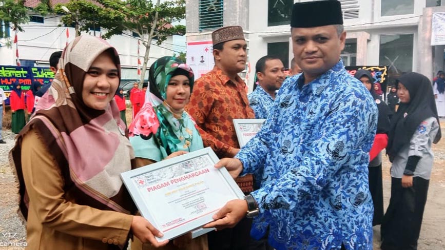 Asisten III, Edy Juanda menyerahkan penghargaan PMR teraktif kapada pembina PMR MAN 1 Aceh Barat, di halaman Kantor PMI Kabupaten Aceh Barat, Selasa 17 September 2019. (BASAJAN.NET/RAHMAT TRISNAMAL)